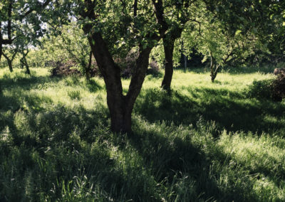 Spätestens wenn sich die Sonne dem Horizont nähert, solltest du unseren Obstgarten besuchen. Auf rund 1.500qm Fläche bricht die Abendsonne so schön durch Äste und die saftig grüne Wildwiese, dass wir selbst uns immer noch ein paar Minuten mehr wünschen.