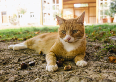 Kalle guckt uns gerne beim Arbeiten zu, hilft aber nie. Wir dachten mal, dass Kalle zu blöd ist um Mäuse zu fangen, bis er dann endlich seine erste angeschleppt hat. An der Maus hing aber noch eine Mausefalle, also war Kalles erste erlegte Maus schon vorher erlegt. Als er dann Mäuse fangen konnte, hat er sich mal eine von einer Elster klauen lassen und ziemlich blöd geguckt. Kalle hat Schiss vor Sturm. Und Kalle war mal 10 Tage verschwunden, bis wir herausfanden, dass er die ganze Zeit da war – er hat sich unterm Fußboden versteckt. Kalle ist immer da, wenn ihr da seid. Außer er is stromern.